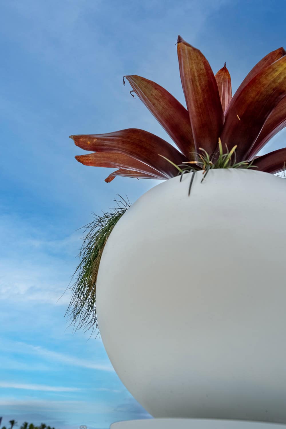 Architectural plants, such as Agave, Dracaena, Chinese fan palm, Gold Cane palms, and orange trees, make bold statements in large pots and planters, providing height and structure.